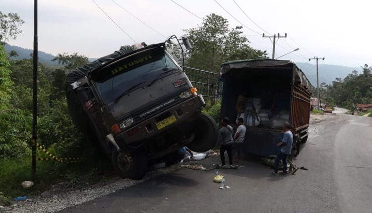 Beginilah kondisi sebuah mobil truck dengan nomor Polisi BA 9830 QU muatan kelontongan dari Medan tujuan Padang Sidempuan, saat melintasi jalinsum batu jomba, di Desa Bulu Payung, Kecamatan Sipirok, Tapanuli Selatan.