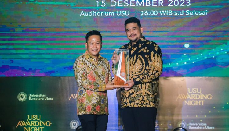Medankinian.com, Medan – Dinobatkan sebagai tokoh yang peduli dan berkontribusi untuk pendidikan Universitas Sumatera Utara (USU), Wali Kota Medan Bobby Nasution mendapatkan penghargaan di malam USU Awarding Night yang digelar di auditorium USU, Jumat (15/12/2033).