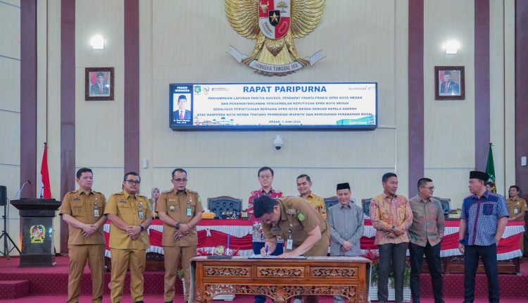 Persetujuan ini ditandai dengan Penandatanganan/Pengambilan Keputusan DPRD Kota Medan sekaligus Persetujuan Bersama DPRD Kota Medan dengan Kepala Daerah atas Ranperda Kota Medan tentang Insentif dan Kemudahan Penanaman Modal oleh Wali Kota Medan Bobby Nasution dan Ketua DPRD Medan Hasyim SE di Gedung DPRD Medan, Senin (3/6).