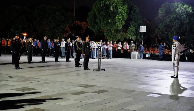 Tepat pukul 00.00 WIB apel kehormatan dan renungan suci yang di ikuti oleh puluhan peserta yang terdiri dari TNI, Polri, ASN serta pelajar ini dimulai. Apel diawali dengan penghormatan kepada arwah para pahlawan, selanjutnya penyalahan obor di iringi dengan pembacaan naskah apel kehormatan dan renungan suci oleh Irjen Pol Whisnu Hermawan Februanto.