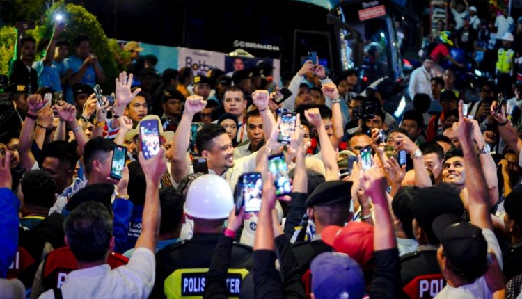 Pantauan awak media, rombongan Bobby-Surya tiba di lokasi sekita pukul 19.50 WIB. Mereka disambut ratusan relawan yang telah hadir lebih dulu di lokasi.