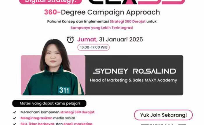 Medankinian.com, Surabaya – MAXY Academy kembali menghadirkan Free Day Class pada Jumat, 31 Januari bagi para mahasiswa dan profesional muda yang ingin memperdalam strategi pemasaran digital. Bertajuk Digital Strategy: 360 Degree Campaign Approach, kelas ini akan dipandu oleh Regina Sydney Rosalind, Manager Marketing MAXY Academy, yang akan mengupas tuntas strategi pemasaran masa kini serta bagaimana mengintegrasikan media sosial ke dalam strategi pemasaran yang efektif.