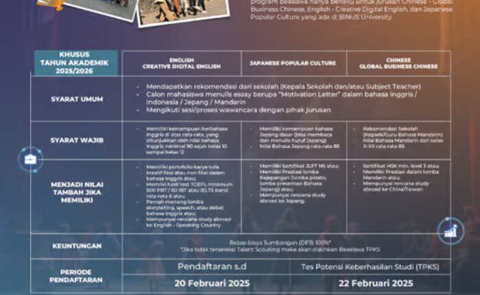 Kesempatan emas ini membuka jalan bagi calon mahasiswa untuk berkembang sebagai ahli bahasa yang mampu mengapresiasi dan menyuarakan keanekaragaman budaya dunia. Program talent scouting yang dibuka sampai 20 Februari 2025 ini menunjukkan komitmen BINUS University untuk menemukan talenta-talenta berbakat yang siap berkontribusi di dunia bahasa Indonesia dan global. Daftarkan diri Anda segera dan jadilah bagian dari program beasiswa bahasa BINUS University yang membuka jalan untuk masa depan yang cemerlang.