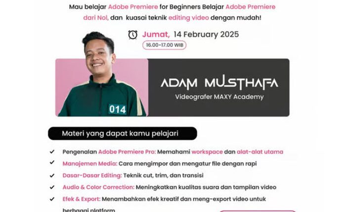 Medankinian.com, Jakarta – MAXY Academy kembali menunjukkan komitmennya dalam memberdayakan talenta digital dengan menyelenggarakan Free Day Class yang kali ini berfokus pada Adobe Premiere untuk Pemula. Sesi ini akan dipandu oleh Adam Mustafa, seorang editor video profesional, dan akan berlangsung pada Jumat, 14 Februari 2025. Inisiatif ini merupakan bagian dari upaya MAXY Academy dalam memberikan kesempatan belajar yang mudah diakses bagi para calon kreator konten.