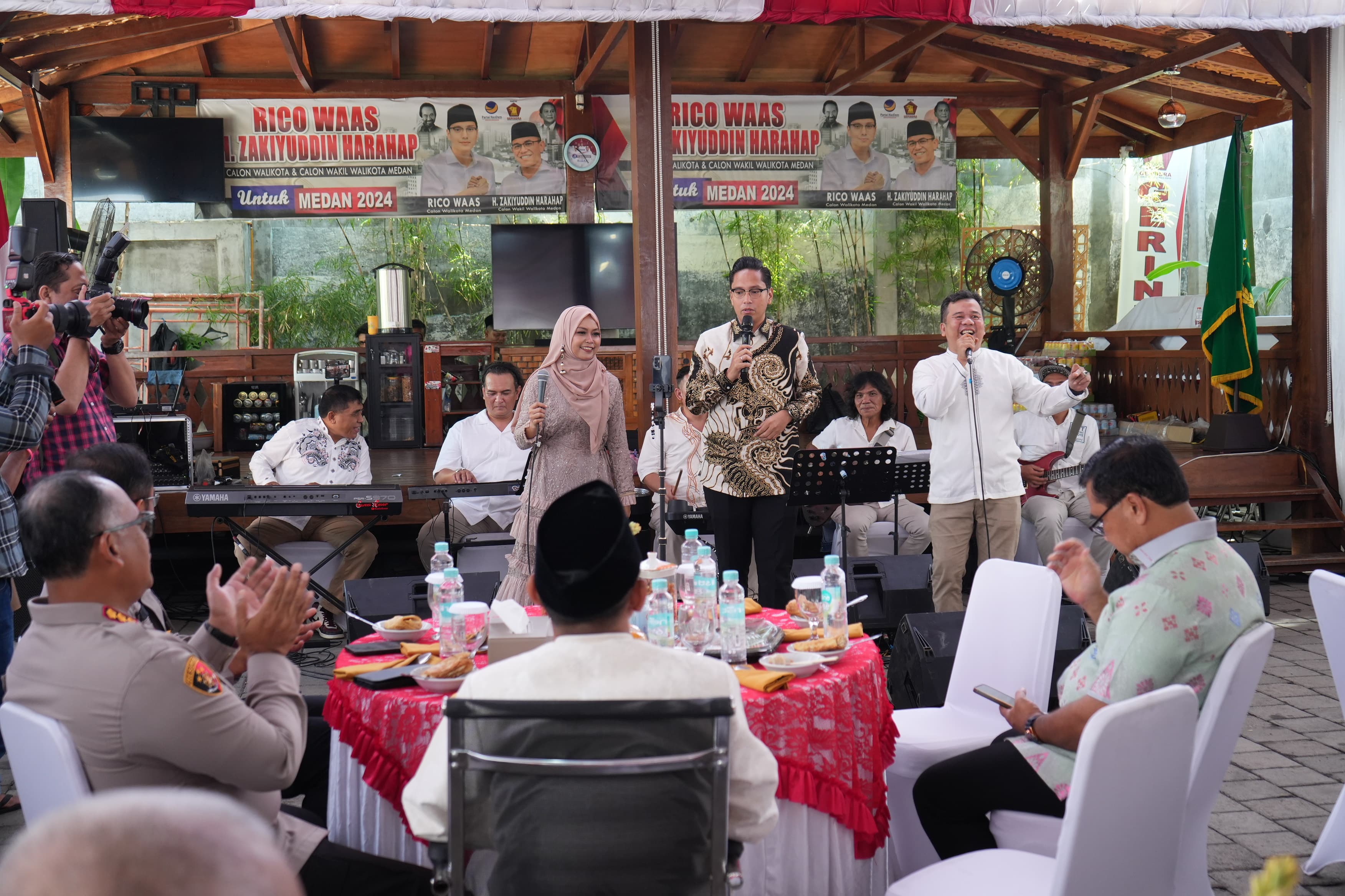 Saat menghadiri acara Open House Hari Raya Idulfitri 1446H yang diadakan di kediaman Wakil Wali Kota Medan H. Zakiyuddin Harahap, di jalan Gurilla, Kec. Medan Perjuangan, Selasa (1/4/2025), Rico Waas mendendangkan dua buah lagu diantaranya lagu Melayu berjudul “Lemak Manis” dan lagu berjudul “Pergi Pagi Pulang Pagi” yang dibawakan group band Armada.