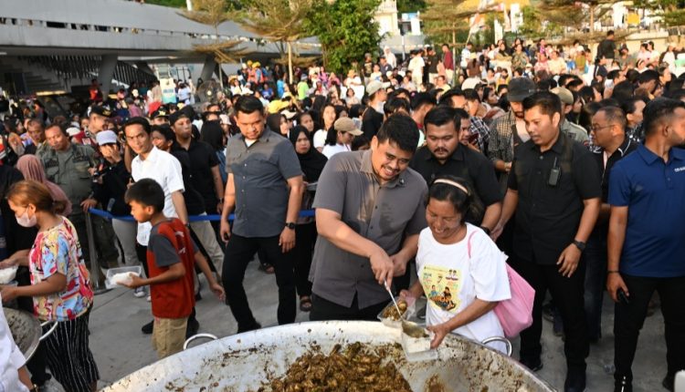 Medankinian.com, Prapat – Acara masak besar YouTuber Bobon Santoso bersama Gubernur Sumatera Utara (Sumut) Muhammad Bobby Afif Nasution berlangsung meriah. Lebih dari 1.000 orang berkumpul di Pantai Bebas Parapat, untuk melihat Bobby Nasution dan Bobon Santoso masak lebih dari 200 Kg ayam.