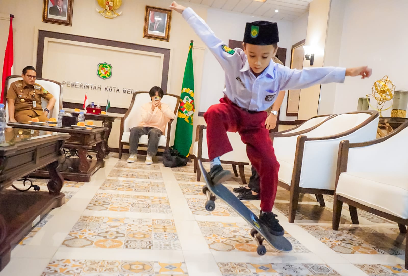 Medankinian.com, Medan – Yazeed Abna Simatupang merupakan Atlet Skateboard asal kota Medan saat menampilkan kemahirannya bermain skateboard di depan Wali Kota Medan Rico Tri Putra Bayu Waas di Balai Kota Medan, Senin (22/9/2025).