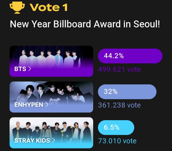 Medankinian.com, SEOUL– Memasuki hari ke-12, Voting New Year Billboard Award 2025 in Seoul yang dilaksanakan Bunjang Global masih menempatkan BTS di posisi teratas meninggalkan pesaingnya ENHYPEN.